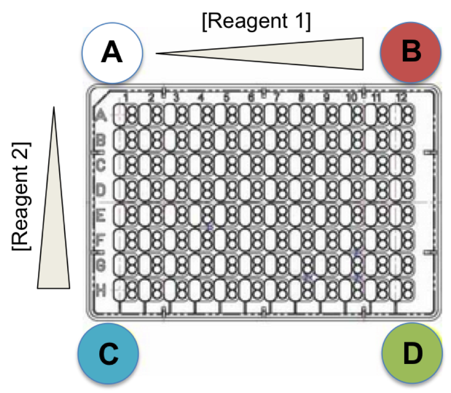 The 4-corner method is used to produce custom matrices with a linear 2D gradient of concentrations across a plate. This method makes it possible to automate theis process very efficiently as it makes the programming of the gradients independent of the stock solutions used. It also reduces the viscosity of the stock solutions in most cases. Finally, very small grandients in absolute terms can be preapred with great accuracy.